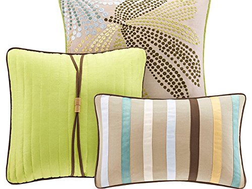 Create a coastal getaway in the comfort of your own home with this tropical inspired quilt set. The quilt and shams feature dusty shades of lime green, powder blue, yellow, deep teal and brown in a floral pattern manipulated by dots of color. The lime green color continues on the reverse of the quilt and shams. Three decorative pillows complete this colorful set with beading, pleating and strapping details in corresponding colors. The set includes: 1- Full / Queen 90x90" Size Quilt & 2- Pillow Shams & 3- Toss Pillows.
