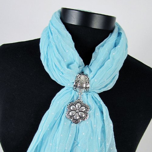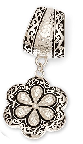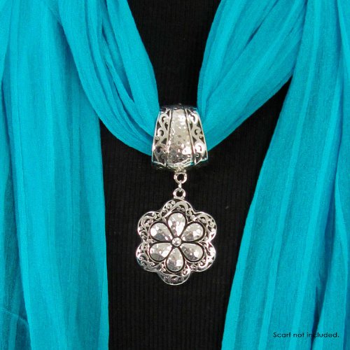 The Flower Slide Pendant Scarf Jewelry has a light hammered metal finish bordered in a swirl design inset with black. This scarf jewelry item easily slides on to many scarves adding a charming touch. This pendant comes in 3 different styles; Flower, Heart, and Butterfly. It measures approx. 3.25 long and the charm pendant is approx. 1.50 in diameter.