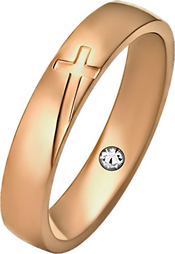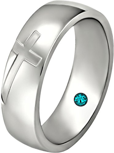 Our couple's ring is an expression of one's love and forever connection. This ring can serve as a wedding band, a promise ring, or anything in between. It is made with 316L Stainless Steel and features a pave set Cubic Zirconia simulated diamond crystal on the inner band, along with an engraved cross on the top.