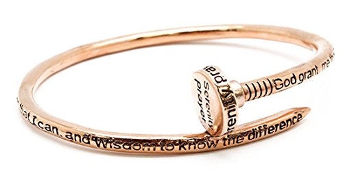 This is a gorgeous Nail bangle that is very popular right now. I have an entire line with different prayers and Scripture verses. This one is finished in a polished rose gold tone and has the entire Serenity Prayer inscribed into the band and filled with a black enamel making it easy to read. It is elongated with an inside measurement of 2 3/4 x 2 1/4 inches, making it easy to put on and take off. The nail is rigid and is not flexible. Makes an awesome faith statement! Comes in a pretty gift box so if you are giving it as a gift, you will not need to gift wrap it.