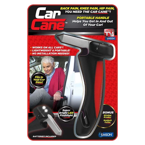 The incredible new Car Cane™ can get you in and out of your car with ease. This new portable handle hooks instantly into the door latches of any car. Simply open your door and snap it on! Car Cane™ hooks into place and will not move. In fact, Car Cane™'s forged aluminum construction can hold 350lbs!Then, Car Cane™ unhooks and stores away easily into the door or glove box. If you are recovering from an injury or someone with back pain, knee pain, or hip pain, you need the Car Cane™. And when it's slippery outside, Car Cane™ gives you a handy grip so you won't slip! It's perfect for those tall SUVs or low compact cars too. So stop struggling and get up with ease! Car Cane™ has a built-in flash light. These super-bright LEDs can last 100,000 hours! It also features a seatbelt cutter and hammer to break glass - perfect for emergencies.Material: Steel, PlasticCare & Cleaning: Spot or wipe cleanWeight: .4 poundsTCIN: 31168537UPC: 080313096631Item Number (DPCI): 070-03-0205If the item details above aren’t accurate or complete, we want to know about it. Report incorrect product info.