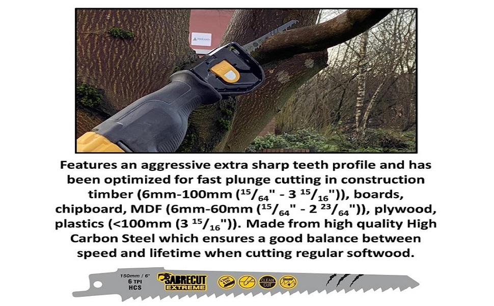 The SabreCut SCRS644D_5 is a professional-grade reciprocating saw blade kit featuring five 150mm blades designed for high-performance cutting. With a 6 TPI tooth profile and made from durable High Carbon Steel, these blades are optimized for fast and efficient cutting through various materials including timber, plywood, and plastics. Ideal for construction and woodworking professionals, this kit ensures precision and longevity in every cut.