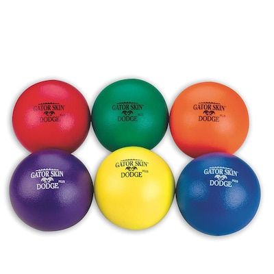 Description Gator Skin® Dodge plus middle school dodge ball has the perfect size and weight for middle school age kids and has Dia of 6 1/2", sold as 6 per set. Gator Skin® Dodge plus middle school dodge ball features a high-density foam and an added bonding layer between the foam and cover. Dodge ball are virtually tear-proof and latex free certified which makes it durable, sold as 6 per set. Size: 6 1/2" Assorted Material: High density foam Ages 10 years and up Exclusive High-density foam and extra bonding layer Bright 6-color set is easy to track Weighs about 1/3rd the weight of a traditional rubber playground ball often used for dodgeball Weight: 120 grams Specifications Sport : Fitness Gender : Unisex Age : Youth Recycled : Yes Brand : Gator Skin Customizable : No Weight : 1.00 lbs. per Pack