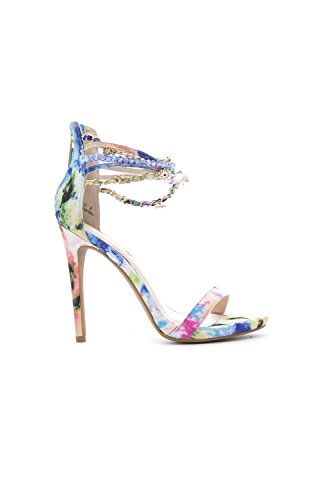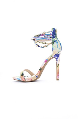 Featuring an open toe front, ankle straps with assorted charms embellishment, watercolor fabric throughout, single strap across vamp, wrapped stiletto heel, lightly padded insole, and rear zipper closure for easy on/off.