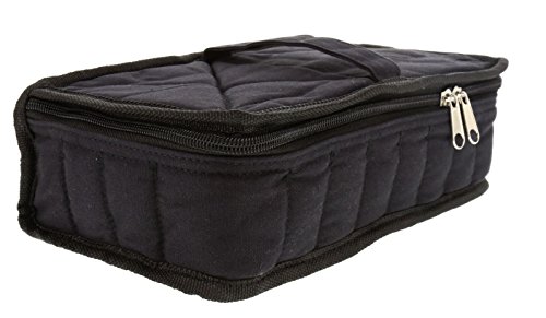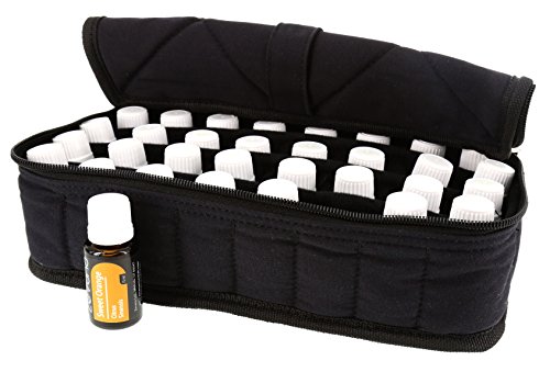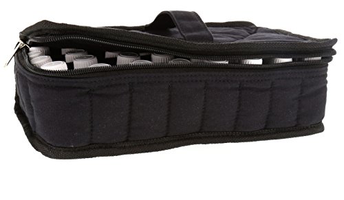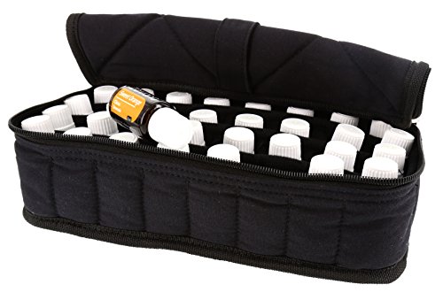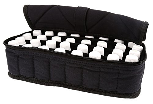 Aroma Oil Tools 32-Bottle Essential Oil Carrying Case for 15ml Bottles - Black w/Black InteriorEssential Oils are an investment in both your personal health and that of your family! The 32-Bottle Essential Oil Carrying Case by Aroma Oil Tools provides a portable option to keep that investement safe and sound!With 32 individual compartments, each bottle is kept safe and secure. The softly-padded cloth dividers separate and protect every bottle. The handle on top keeps the case upright during transportation. It provides great portability for your aromatherapy needs. Whether you're a massage therapist, travel, or want access to your essential oils during the next soccer game, use Aroma Oil Tools 32-Bottle Essential Carrying Case to help keep them safe during transport.The 32-Bottle Essential Oil Carrying Case holds 5ml (milliliter), 10ml, and 15ml bottles. It measures approximately 11" wide x 5" deep x 3.5" tall. Color: Black exterior / Black interior.NOTE: Bottles shown are for example only. They are not included with the Carrying Case.