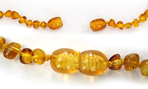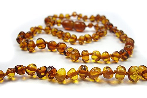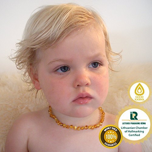 We have The Secret to curing teething pain for babies. Does your baby cry with pain while teething. Do they suffer with a fever, red cheeks and lots of dribble? Your Baby can wear a Baltic Amber Teething Necklace to ease their pain while getting baby teeth. Baltic Amber is effective due to it's its high content of succinic acid. Succinic acid is a natural pain reliever, anti-inflammatory, and central nervous system calmer. Wearing an amber teething necklace is effective on babies and small children because it eases their pain while also having a strong soothing effect on their nervous system - all with no side effects! And an amber teething necklace makes a great baby gift for a newborn boy or girl or a wonderful baby shower gift. Our Baltic Amber Teething Necklace for Baby is 13 Inches (33cm) Long. All of our Baltic Amber is Certified Genuine, Authentic, Natural Baltic Amber and comes with an individual certificate of authenticity from our manufacturer in Lithuania. All our amber necklaces are knotted between every bead to prevent the loss of beads should the string break. The product is not meant to be chewed by the infant it is worn against the skin. Baltic Amber is effective due to it's its high content of succinic acid. Succinic acid is a natural pain reliever, anti-inflammatory, and central nervous system calmer. Wearing an amber teething necklace is effective on babies and small children because it eases their pain while also having a strong soothing effect on their nervous system - all with no side effects! MONEY-BACK GUARANTEE: If for any reason you are not 100% satisfied, please return your Good Karma Zone Necklace within 30 days for a no-questions asked, full refund. Add to your cart now and discover a natural way to a calmer, happier baby!