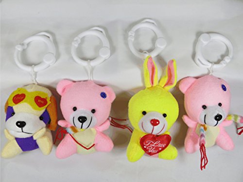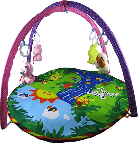 Kidelle Play Mat Play Gym This play mat has a large 33" round soft surface for baby to play. It is big enough so when baby turns he/she won't roll off that fast. The bright colorful design is very attractive and will keep your little one occupied for a while. The soft overhead bars are 28" above the surface of the mat. 4 soft 5" bears hang from the bar. They are interchangeable and removable so baby can play with them in the hand. We strive to provide great customer service, if for any reason you are not satisfied, or you think there is anything missing in the package, just let us know and we will do everything in our ability to fix the problem.