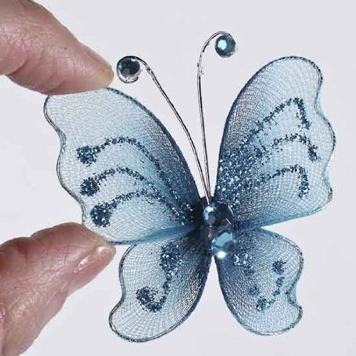 Butterflies are a symbol of new beginnings, joy and transformation making these the perfect addition to any project that you may have in mind. You can create one of a kind ceiling hangings for a baby's nursery or beautiful spring-like wreaths to welcome your guest into your home. Transform a Christmas tree by using butterflies as unique ornaments; adding a bit of whimsy and sparkle. Add these delicate and detailed nylon butterflies to gift packages or floral arrangements for a loved one. These butterflies can add a special touch to any project and make it come to life! These are great for decorating birthday parties, baby showers, wedding showers, holidays, children's rooms and even weddings. Butterflies are popular to use in weddings because of their symbolism of beauty, grace and the start of something new. These would make beautiful wedding favors for your your guest as you start your life as a newly wed couple. These artificial butterflies would also be lovely additions to floral arrangements, such as, bouquets or centerpieces and even cakes! These nylon mesh craft butterflies are adorned with gems and glitter in simple patterns that cover each wing, making them the perfect compliment to any occasion. You can leave as the butterflies as they are or glue/sew on your own clips for easy attaching. You could also add on your own brooch pins, clothespins, or wire for other creative attachments. Each butterfly is approx 2" x 2.5".