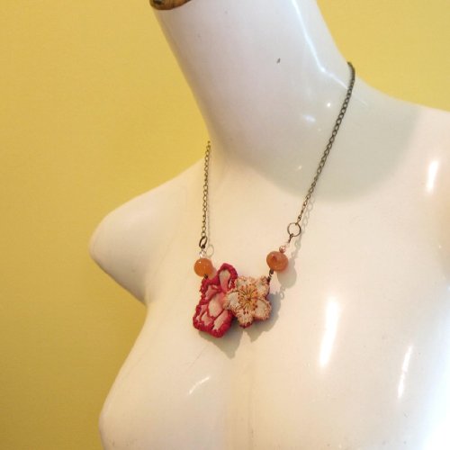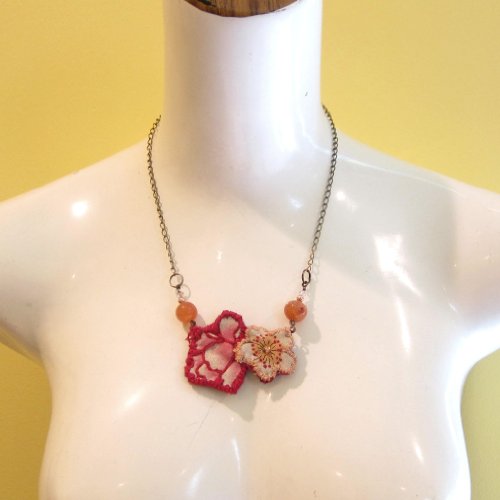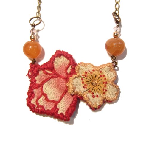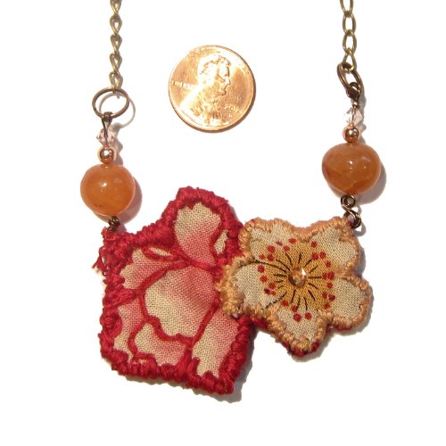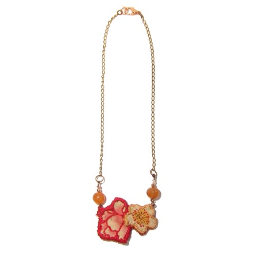 Embroidered Flower Necklace Natural Carnelian hangs on your new embroidered flower necklace. These are orange Carnelian healing crystals polished into orb-like beads. The Carnelian beads hang with hand-embroidered red and yellow fabric flowers. This unique embroidered pendant hangs from an antiqued steel chain with copper accent beads and sparkling pink Swarovski crystals. The necklace is secured with a copper lobster claw clasp at 17" long. Carnelian, also known as Sard, activates the Root, Sacral, and Solar-Plexus Chakras, making it the perfect stone to pull energy into all of the lower chakras. By channeling energy through the lower three chakras, Carnelian enhances one's motivation, survival skills, and creative passion. Carnelian can activate the Sacral Chakra, balancing sexual energy, enhancing one's connection with others and helping relationship and reproductive issues. Carnelian can be worn to protect against psychic attacks from those sending you unwanted vibes, whether consciously or subconsciously. This is a one-of-kind Carnelian and embroidered flower necklace courtesy of Krystals by Kate for I Dig Crystals. You will receive the exact necklace as pictured. Due to the natural state of stones, you may find varying colors, inclusions, veins, surface craters, dips and minerals within the organic crystals. Keep the necklace in the Kraft jewelry box when not in use; add some sea salt or dry brown rice into the box to keep the crystals energetically charged. To receive the items in the picture and listing, make your purchase from I Dig Crystals. We can only guarantee natural stones, items and service when purchased from I Dig Crystals. Enjoy and handle all organic, natural stones with care.