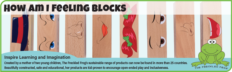 The Freckled Frog FF550 How Am I Feeling Blocks is an 8-piece wooden block set designed for toddlers aged 1+. Featuring over 4,000 mix-and-match facial expression combinations, these FSC-certified beech wood blocks promote social-emotional learning, fine motor skills, and creativity. Finished with non-toxic, eco-friendly paint and lacquer, this durable educational toy supports early emotional development in a safe, sustainable way.