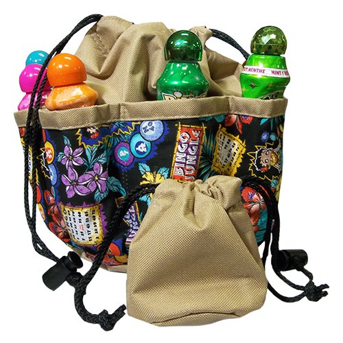 Betty Boop is ready for the heat of bingo and the jungle on this dauber bag. Ten dauber sized pockets wrap around the outer edge of this bag. Two locking drawstrings help to open and close the bag. The pattern shows us Betty Boop in a traditional Hawaiian grass skirt and hula regalia dancing through the lush tropical jungle with bamboo signs displaying bingo cards and "Bingo Jungle". This dauber bag comes with a complementary matching pouch. Daubers purchased separately.