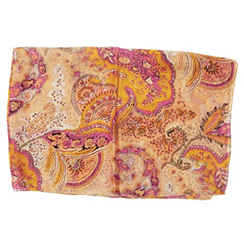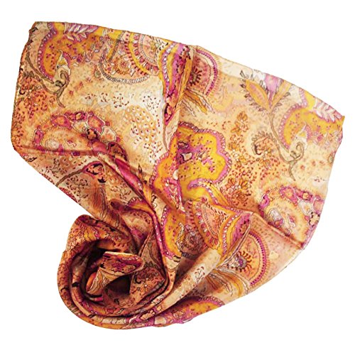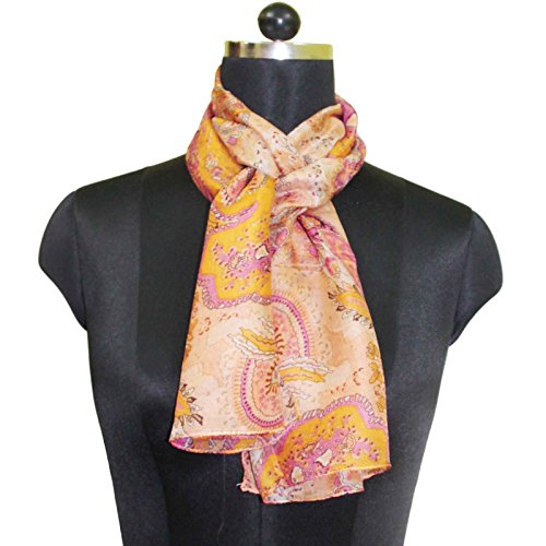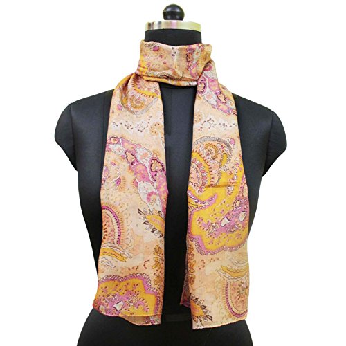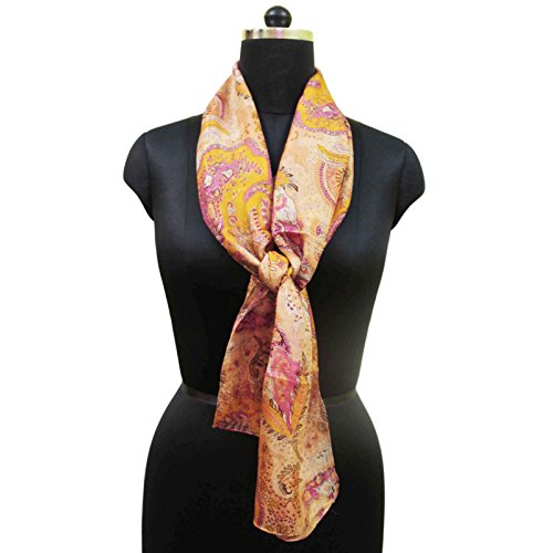 * This is 100% Pure Silk Scarf/Stole fabric. * Base color of the scarf is Light Peach. * Beautifully designed with floral print in peach and pink color on all over it. * Fabric of the scarf is Light Weighted and Smooth. * SIZE: Length-59" x Width-19" Inches (Approx). * Item color shade may be darker or lighter than the picture. * You can be worn around your neck, head, waist, or hair as well as on a hat or handbag, etc.