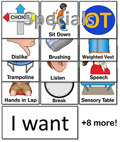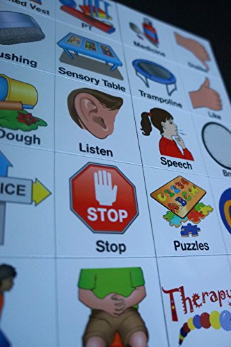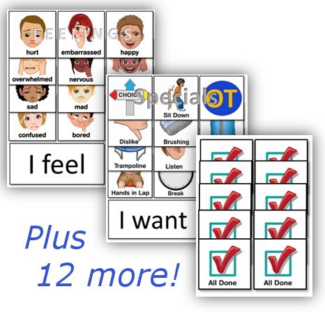 48 magnets including: medicine, trampoline, speech, puzzles, therapy, don't like, like, break, OT, all done, weighted vest, brushing, play dough, choice, sit down, PT, Sensory table, listening, Stop, Hands in Lap; "I want", "I feel", mad, sad, happy, hurt, embarrassed, overwhelmed, bored, worried, nervous, tired, wiggly, scared, frustrated, confused, sick, excited and 10 "All Done" check marks.