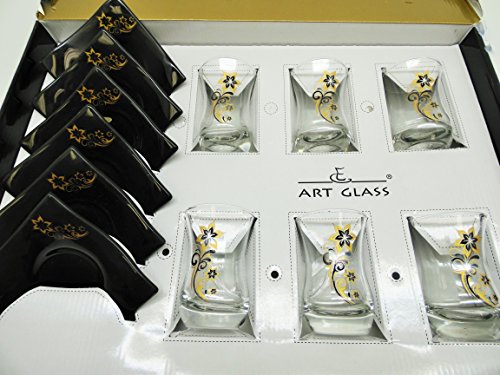 Art Glass Floral Design Tea Set, Set of 13, Turkish Tea Set, Black - Gold Zamsi