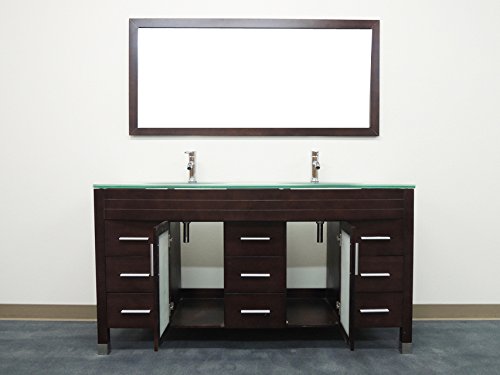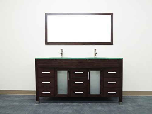 This is 63 inch espresso Bathroom Vanity with with mirror set, solid wood vanity features a clean shaker design in a Espresso finish. With 2 big door cabinet & 9 drawers fitted around plumbing and spacious cabinet with adjustable shelf, there is plenty of storage space. Cabinets are solid wood made, features integrated soft close hinges. This vanity has one piece clear glass top with sink. Product Features: * Color: Espresso * Ceramic sink bathroom vanity * Type: Floor cabinet * Materials: Solid wood & tempered glass * Glass countertop * Faucet and drain: Included * Hardware finish: chrome * Sink: Glass sinks * Mirror included * Cutout for sink: Pre-Cut * Number of doors: 2 * Dimensions: 63" x 22.05" x 33.9" * 2 year warranty