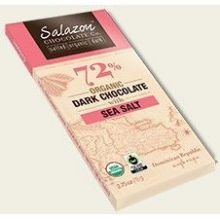 Salazon Organic 72 Percent Dark Chocolate with Sea Salt Bar, 2.75 Ounce -- 12 per case. The original sea salt bar that started it all has become so popular, we had to make a spin off 72 Percent organic dark chocolate is sprinkled with our signature touch of sea salt for a bolder take on our classic sea salt bar. 95 Percentage Organic, Kosher, Vegan, Gluten Free, Wheat Free, Dairy Free Ingredients: Cocoa beans, evaporated cane juice, cocoa butter, sea salt, vanilla. Organic, Fair Trade Certified by Fair Trade USA 99 Percent Fair Trade Certified Ingredients Made In A Facility That Also Handles Peanuts, Tree Nuts, Wheat, And Milk.