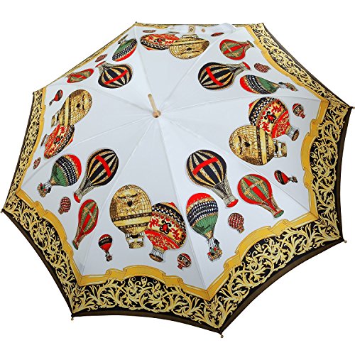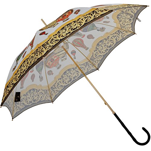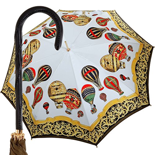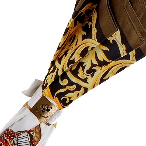 Beautiful handcrafted umbrella with a steel shaft finished with 24K Brush Plating Gold. The handle is is made of leather. The Italian made fabric for the umbrella roof is made of high-quality Italian polyester-satin. Each segment of the canopy is individually printed. An umbrella that looks just as elegant and beautiful when closed as when it?s opened.