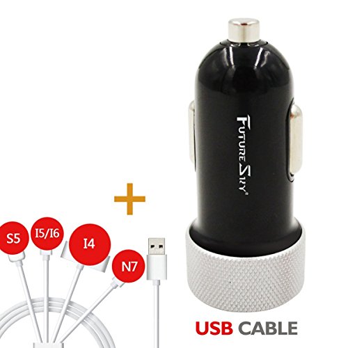 Futuresky®:Thoughts become Things, Choose the Good Ones Features Attractive Design - Futuresky car charger with its brushed aluminum finish and circular blue LED light looks as good as it performs. Safety and Reliability - Using top-grade microchip, ensure you receive full power and also full safety. It can prevent overvoltage, overcurrent, overheating and short circuits. With CE & FCC certified, the car charger is easy-to-use. Efficiency and Speedy - Built with 2 USB ports for charging two devices simultaneously with full speed, you can enjoy uninterrupted use your devices' GPS,music and other functions when driving. Popular Compatible Most of Models : - USB Output: 2 x USB - Input: DC 12-24V - Power: 24W - Output1: 5V, 2.4A - Output2: 5V, 2.4A - Dimensions: 25.8*25.8*57.5MM Gift package includes ? ✓Futuresky 4.8A Charger ✓3.3ft USB CABLE