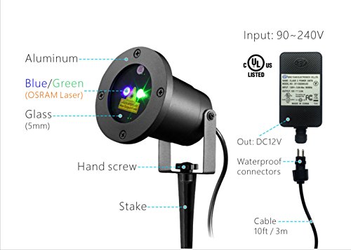 Product description: kindly help us add point bracket and fill in br by each section of below information. Garden Laser Light is a laser light system that illuminates a huge area with thousands of gorgeous, colorful lights. Simply find a location in or outdoors to place it and illuminate a huge area with brilliant blue and green sprinkles.Blue laser points is cool and romantic,much more light output compare to red and green garden laser light. With the remote in hand and extra-long power cable (10 feet), easily control the laser light's modes from a distance. This light year round to bring the stars indoors, to light up a hall or space, or even to create a fantasy world in your little kids' bedroom, Gardens, trees, parties, stage shows, flowers, bars, walls, lawns, sign age, you'll constantly discover new, exciting places and events to make even more wonderful with your garden Laser Light. Note: Thought its FDA approved products and it is not harmful to your health,please don't stare at the beam aperture long time in case that will be bad for your eyes.. Specification: Power Input: AC 120V 60Hz Power Output: DC12V, 2W Length of cable: 10feet Dimension: max. diameter 3.88inch x length 3.65inch IP Protection: IP65 for the light casing and IP44 for power adapter. Materials: Aluminum alloy casing and spike. Tempered glass lens. Spike Height: 6.46inch Working Temperature: -degree Fahrenheit to 104 degree Fahrenheit Remote Control Distance: 33feet Coverage: Best for 5-10 meter,625 square feet to 1500s quare feet What a box include: 1 x Laser Light with Power Cable 1 x Screw 1 x stake 1 x Power Adapter 1 x User Manual 1 x remote Controller 24 hours respond. days replacement