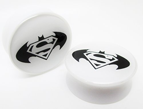 Brand New - Pair of Batman Vs Superman - White - Acrylic Ear Plug - Double Flared Saddle. High Quality, Durable Design. 5/8" (16mm)