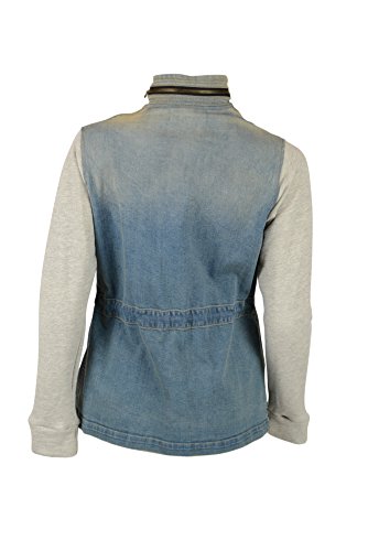 Full zip frontStand up collarSnap buttons down zipFour flap pockets at frontWashed blue denimKnit gray sleevesRuched drawstring at back waist