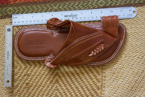Hand-made leather sandals crafted using tools and techniques over 2,000 years old from soft goatskin for unbeatable comfort. Comfort and Simplicity - Soft goatskin covers a thick cushion to make for a snug fit and comfort that lasts. - Open design allows your feet to breathe and prevents odor. - Hand-stitched cowhide protects the tops of your feet from the sun. Crafted to Last Thick bottom sole made of tough camel hide to endure many long journeys into the desert, or wherever your adventure takes you. Social Responsibility Desert Sandals has partnered with a family-run company which employs underprivileged people from their local community, particularly women, with the goal of empowering them socially and economically. Softening the Leather You might find these sandals a little bit stiff at first. This is completely normal, since the entire sandal is made of leather. Once broken in, they will contour to the shape of your feet and give you a custom fit that is snug and comfortable. Measurements size 5: Inner Sole Length = 8 10/16", Total Length = 9 12/16" size 6: Inner Sole Length = 9 4/16", Total Length = 10 4/16" size 7: Inner Sole Length = 9 8/16", Total Length = 10 10/16" size 8: Inner Sole Length = 9 14/16", Total Length = 11" size 9: Inner Sole Length = 10 2/16", Total Length = 11 4/16" size 10: Inner Sole Length = 10 8/16", Total Length = 11 10/16" size 11: Inner Sole Length = 10 10/16", Total Length = 11 14/16" size 12: Inner Sole Length = 10 13/16", Total Length = 12 1/16" size 13: Inner Sole Length = 11", Total Length = 12 4/16"
