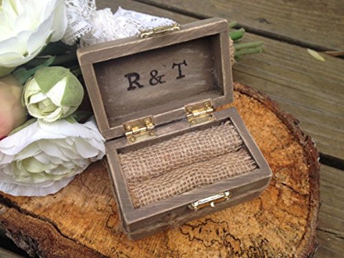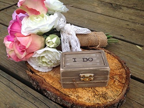 This ring box is the perfect alternative to a ring pillow! The wooden box is hand painted many times and distressed. "I DO" is wood burned on the top, and the couples initials are wood burned inside. Jute is wrapped around the box as well. This ring box has burlap inserts. The dimensions are 3x2x2"