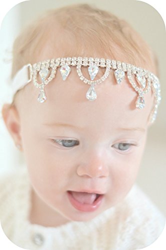 Crystals are elegantly draped along a comfortable elastic headband to transform any child, toddler or adult into a rhinestone princess. These baby headbands are elegant additions to bridal parties, newborn photographs, or even princess costumes for dress up and can be customized to any size you need. Soft snow white elastic gently holds the rhinestone jewel band in place, and by using this combination you can be assured there will be no tugging on hairs. Your little girl will laugh as the jewels catch the sunlight, casting sparkles everywhere. If you would like more information on sizing please message us directly so we can create a custom headband just for you with the following general options available: Baby Headband Child Headband Adult Headband If you would like to continue shopping for more crystal headbands, baby tiaras, and rhinestone hair accessories you may return to the AllureDesigns shop home by following this link: http://www.amazon.com/handmade/allure-designs
