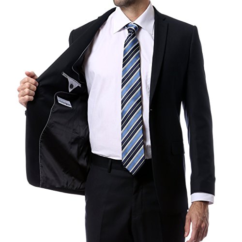 Look sleek and stylish while being the definition fashionable Slim Fitting suit made by Zonettie. By no means does it's low cost reflect it's high fashion value, nor does it mean it lacks in quality. This is a high quality suit as you can note from the excellent feedback. We import these suits ourselves and cut out the middleman in order to pass along the savings. You would normally see a suit of this quality sold in better men's stores for at least twice the price, and we add the convenience of even needing to go to the store to pay higher prices!! Each suit features 2 Button jacket closures with 2 side vents as well as matching flat front trousers that compliment the jacket to achieve a perfect sleek and elegant look. The matching trousers feature vertical side pockets and 2 standard back pockets and come un-hemmed to allow for custom tailoring. A classic yet slim fitting suit creates a look that is PERFECT for any business or social engagement. Made from a SUPER SOFT 65% Polyester & 35% Viscose blend fabric. The suit is extremely versatile as the jacket can also be worn as a blazer an complimented with a pair of jeans. You can get a dress look and a casual look without sacrificing fashion.