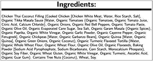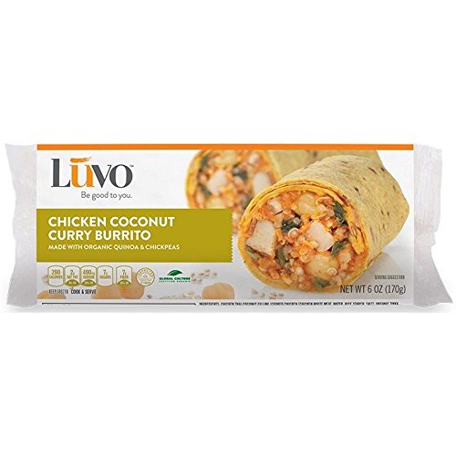 Luvo Organic Chicken Coconut Curry Burrito, 6 Ounce -- 12 per case. Flavors you would find at a SoCal burrito joint, combined with the flavorful, nutrient-dense ingredients you expect from Luvo, make our burritos a delicious grab-and-go snack or meal. 70 Percentage Organic, Dairy Free, Low Sodium, Low Salt, Reduced Sodium