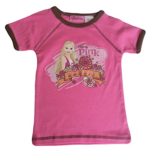 This pink short sleeves graphic tee has brown trim arm and neckline, brown extra stitching arms, shoulders, and hemline, Barbie image and "BARBIE", "think pink" printed on the front and glittery design. 100% cotton