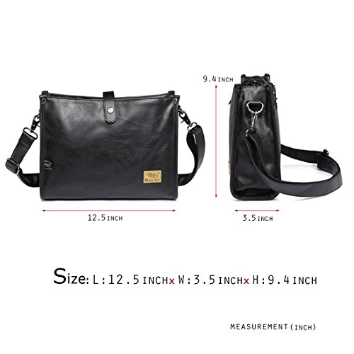 Alafe Top Pu Leather Men Business Messenger Bag Fashion Travel Bag Vintage School Book Shoulder Bag Product Material:Top PU leather fabric, polyester lining; Product Dimensions:L:12.5 inch x W:3.5 inch x H: 9.4 inch Net Weight:1.45 pounds Bag Structure: 1 Main Bag, 1 Compartment Pocket,2 Wall Pockets,1 Pen Pocket,1 Rear Zipper Pocket (please refer to the pictures) Satisfaction Guaranteed: If you are not satisfied, please don't leave us negative or neutral feedback right away. Please contact us via email. We promise to provide 100% fine customer service and try best to make every customer get good mood with fine shopping experience here. How to maintain the PU leather bag? 1.Don't use hot water to clean it; Don't dry the bag under sun exposure 2.Recommend to use the rag to wipe it directly and avoid to wash the bag frequently. Attention: 1.Please confirm the bag size according to our description instead of photos; 2. Due to different measurement, it may exist 1-2 CM error. 3. As the fabric of the bag is PU, there is smell when you receive the bag. Please use a wet cloth to wipe it and put it in a ventilated place hours, the smell will fade away.