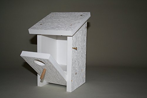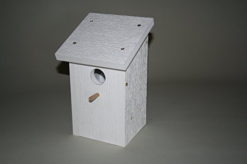 Bluebird house made of PVC to last for many generations of Bluebirds.Brass screws and opens for easy cleaning.About 12" tall and 6x6 wide.