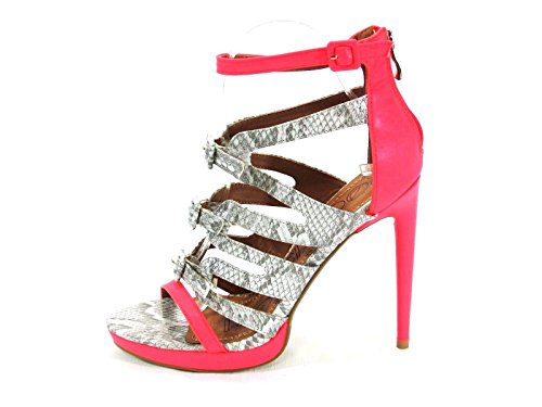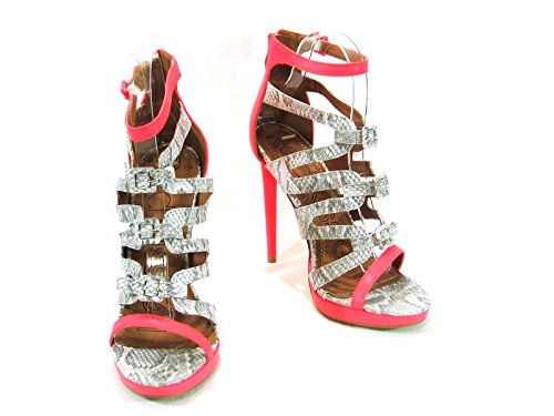 Red Kiss Neon Coral, Grey Snake Faux Leather Strappy High Heel Sandal Size 10m