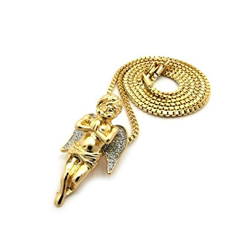 Sparkled Micro baby Angel Cherub Pendant 2mm 24" Box Chain Necklace Gold Tone
