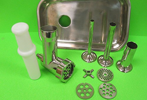 Sausage tubes have three exit diameters. 7/16' for narrow sausages like breakfast links and snack sausages. 3/4" for traditional links 1 1/4" for large sausages and fast filling of meat freezer bags. Fits old and new 4.5, 5.0, 6.0, 7.0 and 8.0 quart stand mixers including the K45SS, KS5 series, KS6 series, Artisan and Professional series. High quality polished precision stainless steel. Also fits Omcan mixers and Hobart n50, c100 mixers. This high quality stainless steel attachment is restaurant grade material and dishwashers safe. Made by Smokehouse This unit is made exclusively to fit many countertop mixers. Mounts securely into the front power drive. Parts include the cylinder, auger, ring, pan, stomper, knife and (3) grinding plates. PLUS you will receive three stainless steel stuffing tubes for sausage making and filling meat bags. Easy disassembly for cleaning. Weighs 5 lbs. Loading pan is 6" x 8". Much heavier and stronger than aluminum or plastic versions.