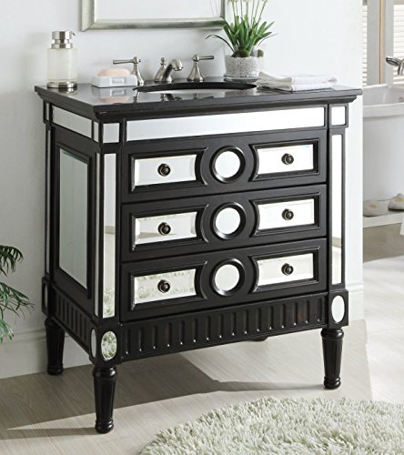 Dimensions: 32 x 21 x 36.5"Happrox. Give your bath an extraordinary custom look with these beautifully crafted pieces. These lovely mirrored bath pieces reflect a taste for modern elegance. Antique look trim adds vintage flair. The beautiful vanity sink features a black galaxy counter top and a white porcelain sink. Counter top is made of the highest quality that will resist prolonged exposure to humid conditions and long life durability Other details: Two functional drawers; second and third. Includes Mirror with this order Clear beveled mirrors 3 holes - 8" spread, Faucets sold separately for $125 Simple assembly required