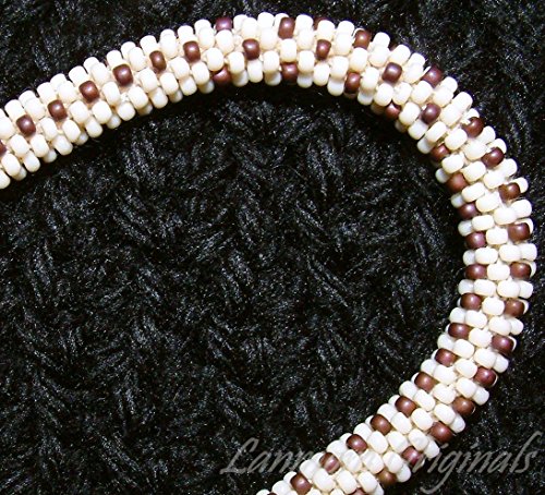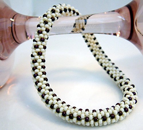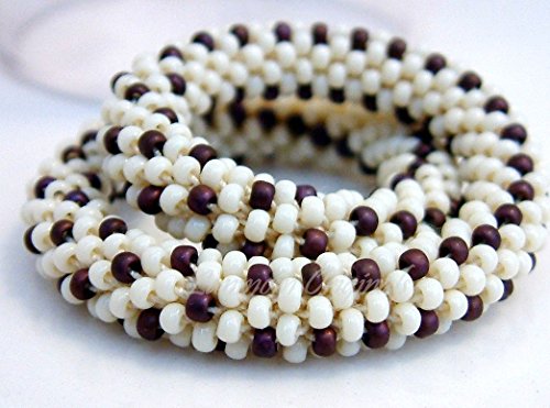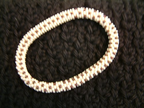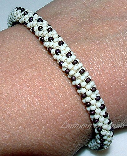 Sweet bead crochet bracelet! This lovely beaded bangle is made with hundreds of top quality glass seed beads in Cream and Maroon. The dark maroon lines snaking through the ivory cream make for a bracelet that looks sweet enough to eat. This is a light and lovely piece perfect for winter or any time of year! The bracelet is 1/4" in diameter and approximately 7 1/4" in circumference. It stretches slightly to roll on and off easily, and although it is light and comfortable it is also tough and durable! As with virtually everything I make, this pattern is my own creation and lovingly crafted in a smokeless and petless home. This also looks great in other color combinations. Please note that I can also make a necklace, bracelet or earrings from almost all my patterns! Pleasee aware that although your bracelet will be very similar, it will not be *the same*. Due to variances that naturally occur in handmade artisan work, all my pieces are one of a kind!