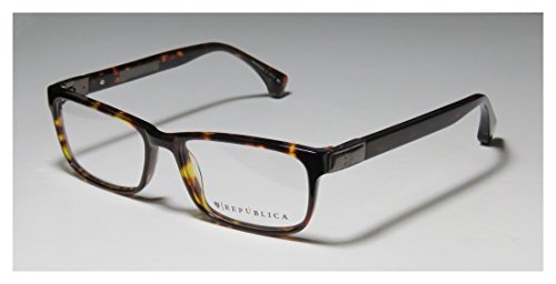 Brand: RepublicaStyle: WabashGender: unisexFrame Type: full-rimFrame Material: plasticCase: originalSize: 54-16-140Color code: toFrame Color: tortoiseLens Color: demo lensesLens Height: 33 mmThe glasses are tortoise. The frame is fully rx-able and can be fitted with prescription and/or tinted lenses at most optical stores. Please note that factory demo lenses have a logo stamped on them in ink. These eyeglasses are made of high quality, durable acetate plastic. The frame has spring hinges. Spring hinge temples prevent you from stretching the fit of your glasses and ensure that they remain intact and not become loose or out of shape. Original case is included.These eyeglasses retail for $180.00 at upscale stores that carry designer frames. Save your money and get them here! The pictures cannot fully reflect the beauty of this piece of designer eyewear. These eyeglasses look even more elegant in real life. This is one of the most popular Republica styles on the market right now.