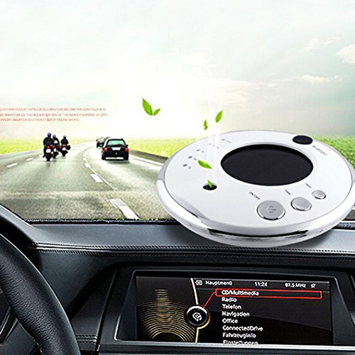 Specifications: Color: Black&White Size: 130*30 mm Energy: Solar energy storage or 5v external power. Applied area: about 20 square meters. Consumed Power: less than 0.6W. Water tank capacity: 100ml. It lasts 6-8 hours. It can be used in car, bedroom, living room, home and office, outdoor travel, etc. How to use it? 1. Gently remove the rubber plug at the inlet, use configuration to add pure water (less than 100ml) into it. Don't wet the surface of the aromatheraphy machine shell. 2. Drop pure essential oil 1-2 drops into the water through configuration. 3. Cover back to the plug. Notice: Check the water is available before starting up, it cannot work without water. Prohibit the use of tap water to avoid the blockage of atomizer. If it's blocked, please gently wipe the mist vent with a clean cotton swab dipped into the water, and then try it again. Keep upright and avoid circuit fault in case of liquid leakage. Three buttons: spray adjusting switch, spray timer switch and power button. Five LED indicators: RED light-power indicator. Green light-spray adjustment indicator, three blue lights are respectivelyfor one-hour continous spray, 10-second spray at intervals of 3 seconds in an hour, and 3-second spray at intervals of 3 seconds in an hour. Automatically stop after working continously for one hour. If you wanna use it continously, please press the power button. Change water every day, ensure bring pure and fresh air to you. Enjoy life! Package Content: 1x Car Air Purifier 1x USB cable 1x USB plug 1x anti-slip mat 1x absorption bottle 1x essential oil 1x Manual