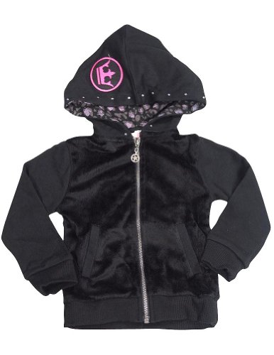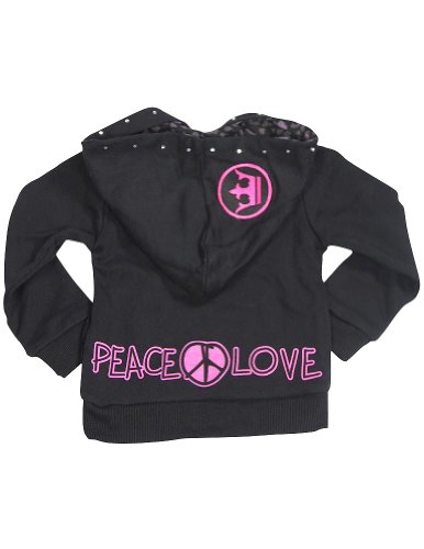 Wild Mango - Girls Punk Princess Zip-up Hoody Jacket, Black, French Terry With Faux Fur , Front Slit Pockets, Ribbed Cuff Wrists and Waistband, Jeweled Trim Hoody with Leopard Lining, Peace Love Graphic on Back, 80% Cotton 20% Polyester, Made in China, #32119 32-119