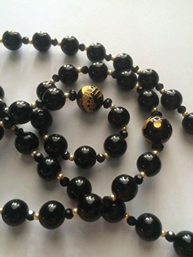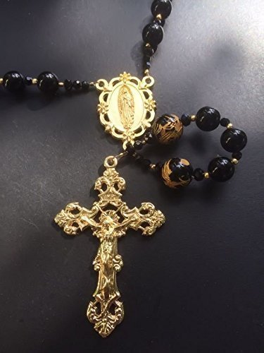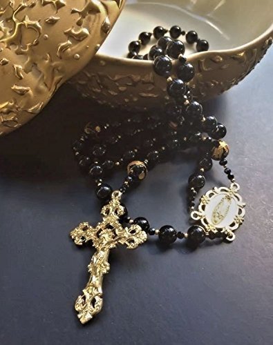 Materials: Black Agate, Black Onyx with 14k Gold Etching, 14k Gold Plated Miraculous Center and Crucifix, Crystal and Glass Seed Beads, Jeweler Wire. There is something very special about this rosary. It is a timeless rosary made of shiny black agate beads with the most exquisite Our Father beads made of black onyx with beautifully detailed 14k gold etching. The beautifully detailed and ornate crucifix and Miraculous medal center are 14k gold plated made in Italy. Each rosary comes with a Cotton Lined Gift Box, a Euro Suede Jewelry Pouch, Holy Card and Certificate of Authenticity. All of my rosaries are ready to ship USPS PRIORITY MAIL (3-Day) with tracking and insurance included (Domestic). Purchased made outside the US are shipped First Class International.