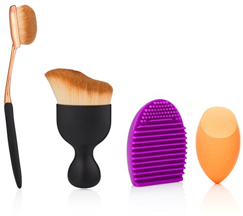 The makeup set includes 4 items: Oval foundation brush, make up brush cleaning board, LATEX-FRE makeup pro blending sponge , S-Shaped Curved brush This Fashion toothbrush design, high-quality synthetic hair which provides superb ability to hold powder, soft and pleasing for your skin; Achieve flawless foundation application with this brush, creates a polished look with full coverage; Use it to get more precise powder application, blend out harsh lines, create new shades of color, and even use it with darker shades to tone them down or with a highlighter to give a gorgeous luminous effect; Very soft hair, it is comfortable for your skin. Good fit for sensitive skin, it can protect and beauty your skin well. Oval Makeup Brush: 5.9-0.8-0.8 inch Curved S-Shaped Makeup Brush: 3.4-1.97-0.98 inch To Clean Your Brushes: 1)Place brushes in warm water 2)Apply a small amount of gentle shampoo (baby shampoo recommended) and work into a light lather 3)Rinse brushes thoroughly under running water. You will notice that the water leaving the brush is tinted from protective coating 4)Continue rinsing until no color leaves the brush 5)Allow it to air-dry