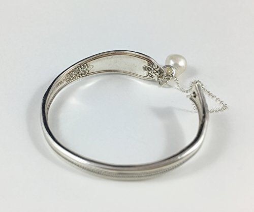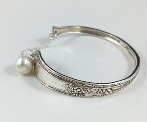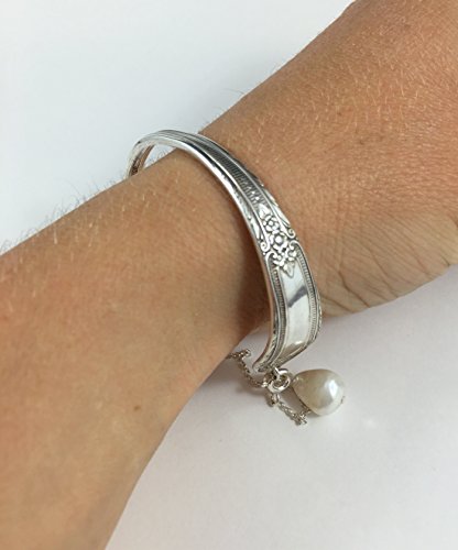 This spoon bracelet has been made from the handle of a vintage silver spoon, I have bent the handle around into the shape of a bangle and the ends attach with a sterling silver safety chain. I have attached a beautiful cream fresh water pearl to it. The wonderful thing about these bracelets is that you don't need to be a gentle with them - simply ease the ends apart, slip it on your wrist, and then squeeze it closed to get the perfect fit. They are easily manipulated to your wrist. Measurements: Widest part of the bracelet:14 mm / 0.55" Narrowest Part: 5 mm / 0.19" Chain: 1 mm wide Georgina Baker Jewellery is a ten year old jewellery brand that is stocked in boutiques all over the world. Originally started in Auckland, New Zealand, Georgina now designs and makes her jewellery in Vancouver, Canada. Each item comes sweetly packaged. Visit my website for more information and styles: www.georginabakerjewellery.com And my facebook page: https://www.facebook.com/GeorginaBakerJewellery