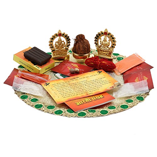 Besides giving you great offers and variety of products Ethnic Style gives you a new range of festive and home décor items to make your festivals easy and fun-filled events with your loved ones. This stainless steel thali having beautiful green stone embellishment on its center and all over covered with designer colorful stone studded lace work. This thali consists of everything you may need to perform a virtuous pooja, consist of idol of Lakshmi Ganesh ji embellished with classic meenakari work made up of light weight matel material, 1 Pouch of kumkum, 1 pouch of Sindoor, 1 pouch of Akshat, 1 aarti book, 1 prarthna book, 1 packet of dhoop, 1 shreefal, 1 mouli bundle, 1 packet of mishery, 1 betalnut, 1 kalash, 2 containers, 1 stainless steel decorated thali and all necessary items. This decorative thali is all prepared with love and devotion. Aiming to cater to your every need, this set is ideal for any special event. This will definetly light up your festival with love and joy. This Poojan thali set makes a perfect Diwali gift to convey your wishes of luck and prosperity to your loved one. Made up of high quality stainless steel. meenakari work made up of light weight matel material.