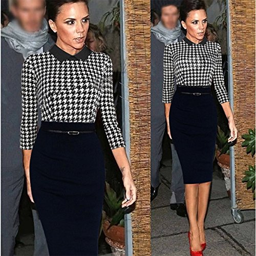 Leisure Beauty-Lady Long Sleeve Plaid Patchwork Pencil Sexy Dress Wear To Work Office Dress (M)