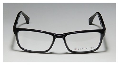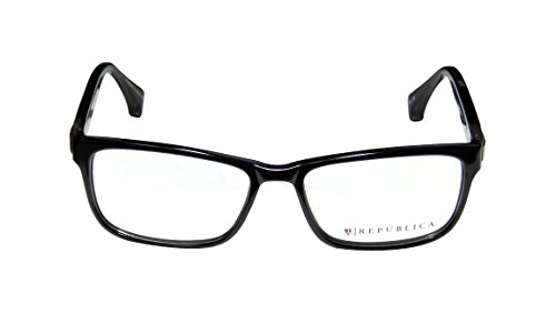 Brand: RepublicaStyle: WabashGender: unisexFrame Type: full-rimFrame Material: plasticCase: originalSize: 54-16-140Color code: bkFrame Color: blackLens Color: demo lensesLens Height: 33 mmThe glasses are black. The frame is fully rx-able and can be fitted with prescription and/or tinted lenses at most optical stores. Please note that factory demo lenses have a logo stamped on them in ink. These eyeglasses are made of high quality, durable acetate plastic. The frame has spring hinges. Spring hinge temples prevent you from stretching the fit of your glasses and ensure that they remain intact and not become loose or out of shape. Original case is included.These eyeglasses retail for $180.00 at upscale stores that carry designer frames. Save your money and get them here! The pictures cannot fully reflect the beauty of this piece of designer eyewear. These eyeglasses look even more elegant in real life. This is one of the most popular Republica styles on the market right now.