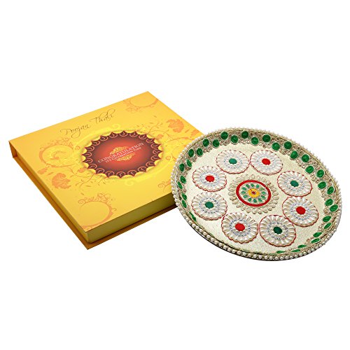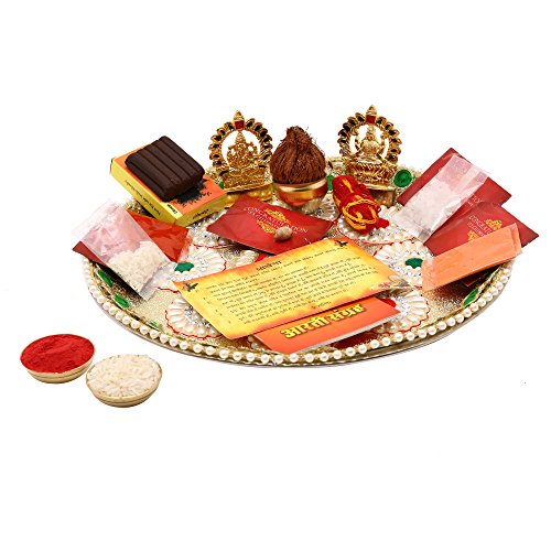 Bring a touch of tradition to your Festival celebration or connect with the Hindu faith and bring some virtuous things at your place. Ethnic style brings hand art work pleasing deepawali, navratri poojan thali set is all set to make your festival easy and fun-filled. This pooja thali set is must at your place for god worship and festival gift this can hold all your pooja items easily at a spot. Get into a festive atmosphere with this designer decorated pooja thali set adorned with fabulous pearl and stone studded embellishment all over the thali. This thali consists of everything you may need to perform a virtuous pooja, consist of idol of Lakshmi Ganesh ji embellished with classic meenakari work made up of light weight metal material, 1 Pouch of kumkum, 1 pouch of Sindoor, 1 pouch of Akshat, 1 aarti book, 1 prarthna book, 1 packet of dhoop, 1 shreefal, 1 mouli bundle, 1 packet of mishery, 1 betalnut, 1 kalash, 2 containers, 1 stainless steel decorated thali and all necessary items. This decorative thali is all prepared with love, devotion and will look great, stunning on holy occassions. All items in the sales package are systematically packed in a beautiful gift box.