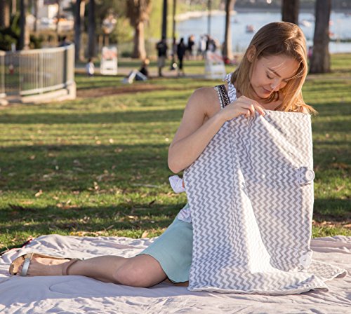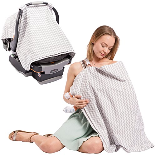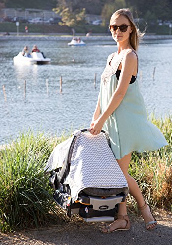 Two in one baby car seat and breastfeeding apron, perfect for moms on the go. Introducing our 100% natural bamboo muslin fabric car seat cover and breastfeeding apron. This must have accessory for moms and babies alike is the perfect way to give your baby a snug and secure zone of protection while giving you the peace of mind of an easy and discreet feeding session wherever you go. Our car seat canopy is designed to fit all major brands of newborn car seats such as Graco and Evenflo and acts as the perfect deterrent from wind, rain, insects, and harsh light. The dual function of our canopy allows you to easily detach it from your car seat and use as a discreet yet stylish apron for breast feeding or burping. Stop stressing about finding discreet place to feed your baby and travel in style with this two in one car seat cover and breastfeeding apron. The elastic and fitted stitching gives added security and stability even in high winds. Protect your baby from the elements while giving him or her a secure, snug and breathable canopy to rest and sleep under. Constructed of 100% natural bamboo muslin fabric our car seat cover is hypoallergenic and 100% free of harmful synthetics of BPA filled plastics. Ultra soft and breathable our canopy is guaranteed to creates a warm yet easy to breathe environment for your little one. Stylish chevron pattern is a great look for both boys and girls. Travel with the security and protection of this two in one canopy and apron. Ideal for use in shopping centers, vehicles, parks, airports, or anywhere you need to feed with privacy. Stop stuffing your diaper bag with blankets or shawls to use as cover and reduce your daily load with this everyday accessory you won't be able to live without.