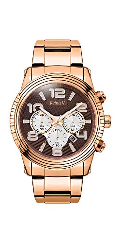 At Reina V we specialize in producing ageless timepieces in a variety of styles so you'll always have the perfect accessory to kick your look up a notch. This classic addition to Reina V's Steve Collection is a fashionable sports watch that has rugged features, including a stainless steel band with a masculine look and feel, a brown textured design in the watch face that plays perfectly against the decorated rose gold and brown crown and bezel. This watch is extremely durable and is great for a rugged yet classic look that is suitable for any occasion. FEATURES:• Sophisticated & Classic • Rose Gold Stainless Steel Case & Band• Analog Display• Deployment Clasp• Japanese Quartz Movement• Water Resistance: 10 atm (Suitable For Everyday Use & Swimming)• Functions: Precision Chronograph• 2 Year Manufacturer WarrantyDimensions:• Case Width (Without Crown): 47 mm• Case Width (With Crown): 50 mm• Case Thickness: 13 mmThis elegant Reina V sports watch features a 47mm case, a masculine stainless steel band, a precision chronograph dial that tells the date and features a 24 h indicator. This innovative, modern dial is rugged yet fashionable with a brown patterned dial that perfectly borders the three sub dials and and the specially decorated bezel completes the look for the perfect combination of functionality, durability and style.About Us: Reina V is a fresh fashion watch brand based in Belgium. Reina V is an ambassador of style, modern design & quality. With original, trendy & innovative designs, Reina V is a trend setter rather than a trend follower. Reina V is proud of its product quality. Every watch is crafted with high quality materials. With a wide range of color combinations & styles Reina V presents its fashion concept: Reina V - VERY YOU!